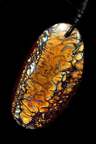 Boulder opal is a close cousin to black opal in that the ironstone boulders that host the opal color when found in the background of the stone have a similar effect to the black ‘potch’ associated with black opal from Lightning Ridge. New South Wales.